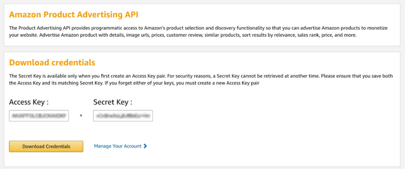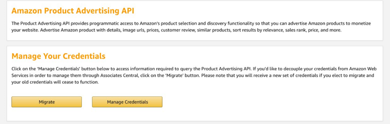 If you are an existing Product Advertising API customer and your security credentials are linked to an AWS account, you can migrate your Product Advertising API account from AWS. If you choose this option, you will decouple your AWS account from your Product Advertising API account. You will get a new pair of credentials directly in your Product Advertising API account.