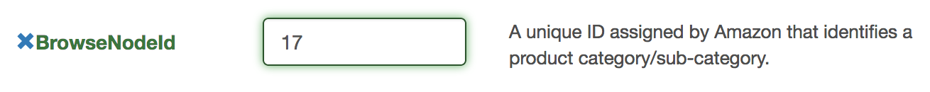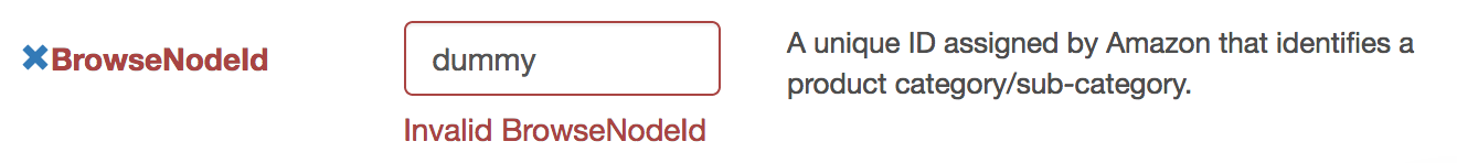 BrowseNodeIdaccepts only positive integers as input, hence, supplying alphabets to it will flag the parameter as red. For reference, see the image below: